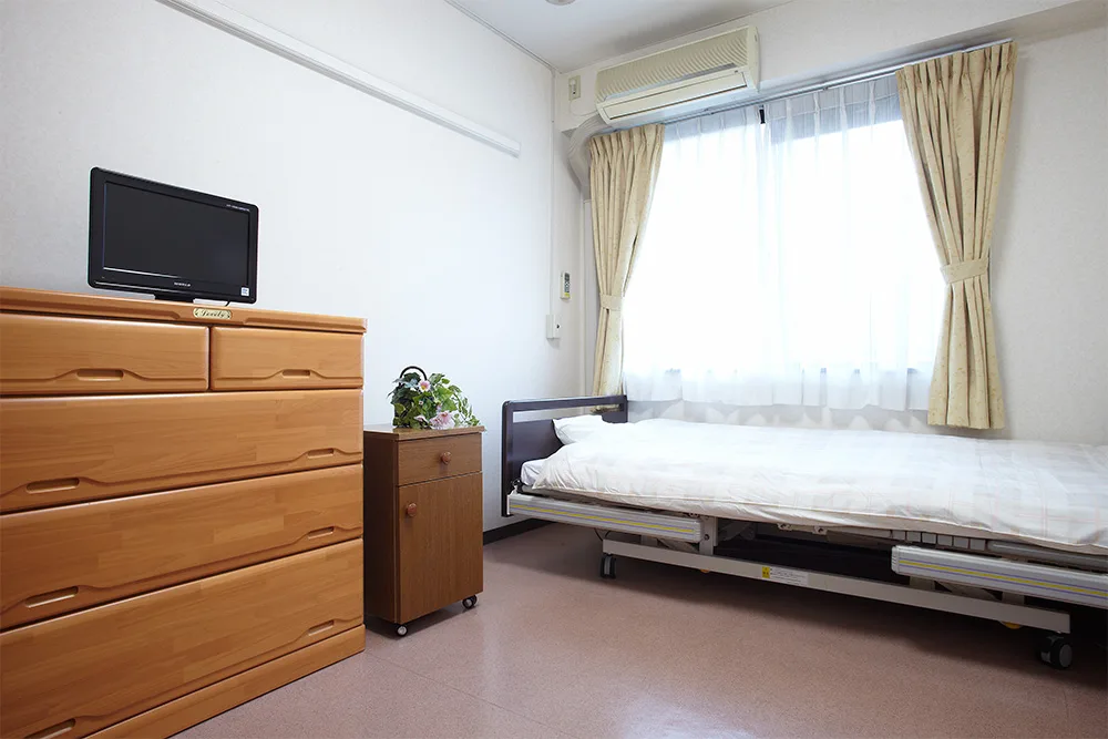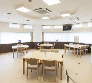 居室数は全37室、お部屋はプライバシーにしっかりと配慮された完全個室をご用意しています。居室内の設備としてナースコール、介護ベッド、収納、テレビ、エアコン、照明、カーテンなどが備えられています。居室には水回りがないため、共用部で他のご入居者様と交流を深める機会が多く、食堂などの共用スペースでは交流の場として賑わいを見せています。共用部は開放的な空間で、自宅のようにお寛ぎいただけるよう工夫を凝らした空間設計となっています。浴室は大浴場のほか、機械浴槽も完備されていますので、どなたでも入浴をご堪能いただけます。