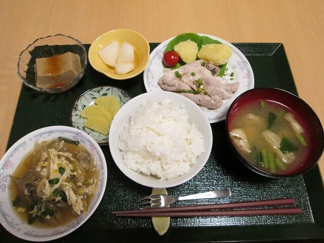 居室内にはキッチンが付いていますのでお部屋でお料理できますが、館内に食堂がありますので食事を作れない日などにご活用いただけます。提供している食事は旬の食材を使用したメニューで召し上がっていただいています。家庭料理を中心とした作り立てのあたたかい食事は、ボリュームもあり大変、好評をいただいています。