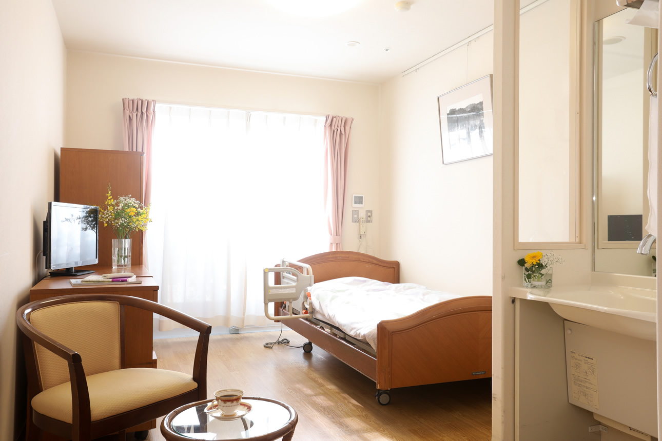 地上4階建て、居室数は全44室のご用意があります。お部屋はプライバシーに配慮された空間ですので、愛用の家具をお持ち込みいただき、自分だけのリラックス空間にしてお過ごしいただけます。居室内にはナースコール、介護用電動ベッド、トイレ、洗面台、収納、チェスト、エアコンなどの充実した設備が備えられていますが、愛用の家具をお持ち込みいただけます。また、テレビもお持ちみいただけますが、レンタルすることも可能となっています。浴室は共用部にあり、お身体状態に合わせて入浴いただけます。足元は滑り止めがあるなど安全面にもしっかりと配慮されています。浴槽は機械浴槽と檜浴槽の2タイプのご用意があります。