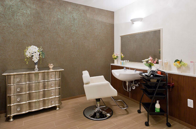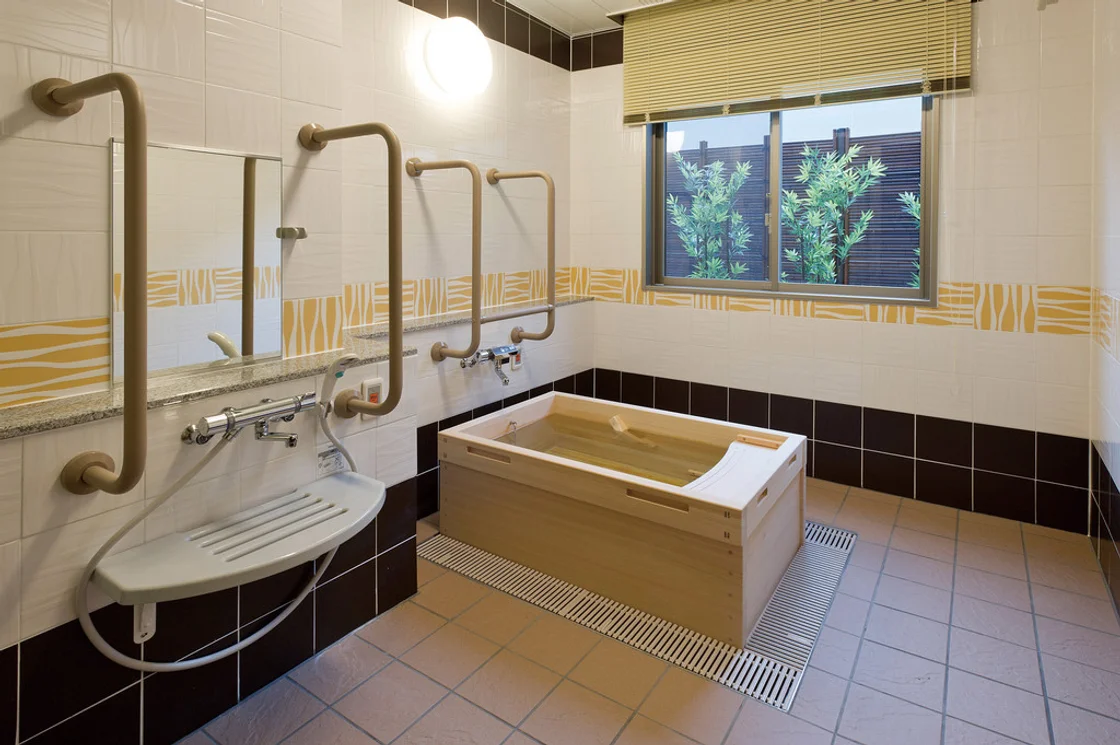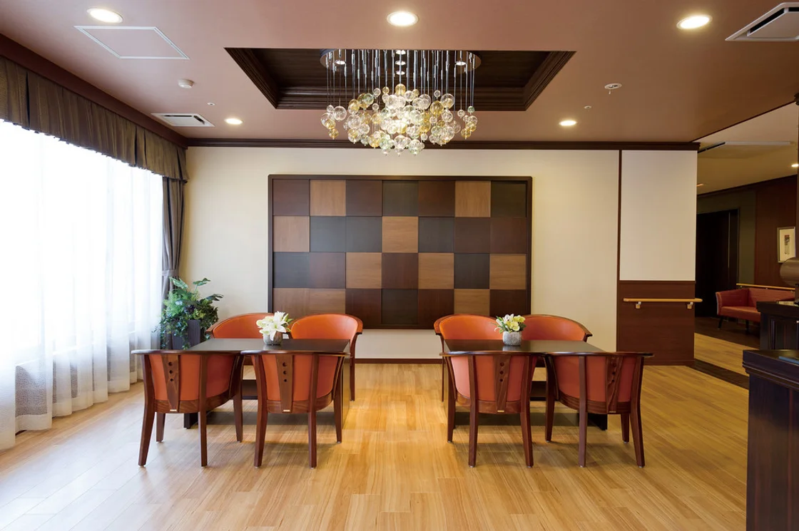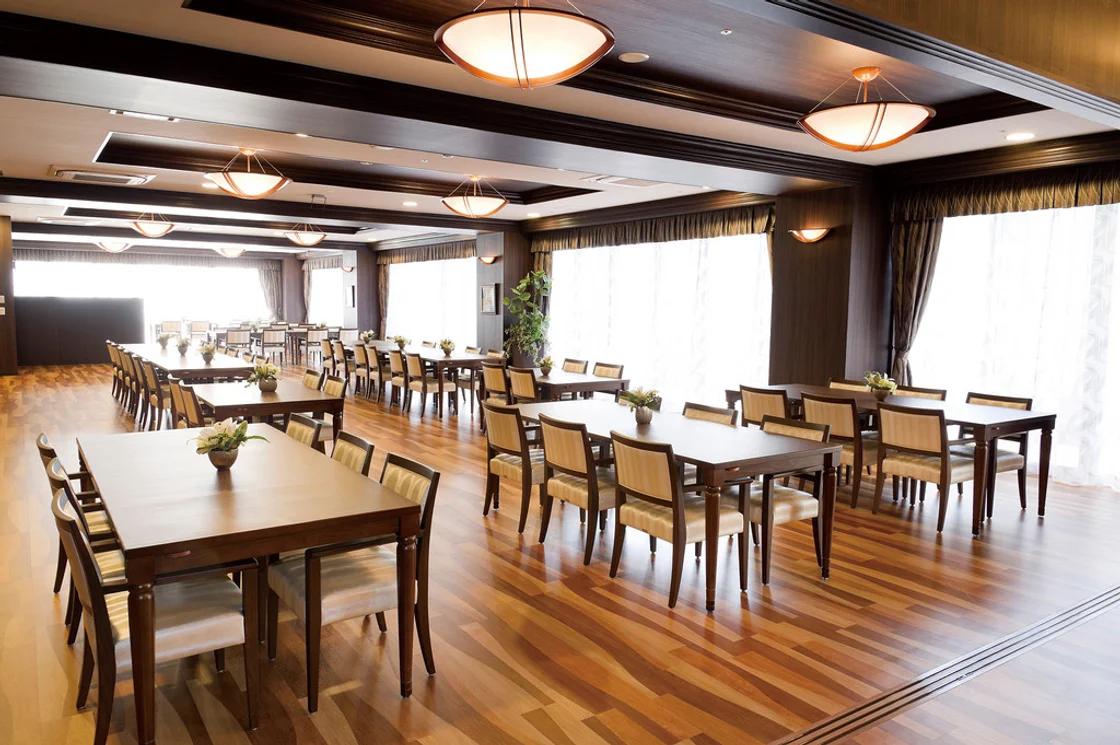 緑が豊かな環境に施設はございます。館内は木を基調とした開放的な空間で、談笑を楽しめるエントランスやカフェスペース、大きな窓に面していて明るさいっぱいの食堂、髪の毛を整える理美容室があるなど共有スペースは充実しています。居室数は全70戸、居室面積は20㎡以上あり、ゆとりのある広さが確保されています。居室内にはナースコール、介護ベッド、トイレ、洗面台などの設備が完備されていますし、ナースコールは各室とトイレに設置されていますので安心してお過ごしいただけます。