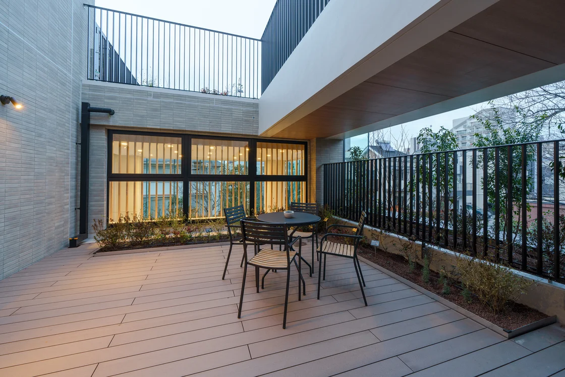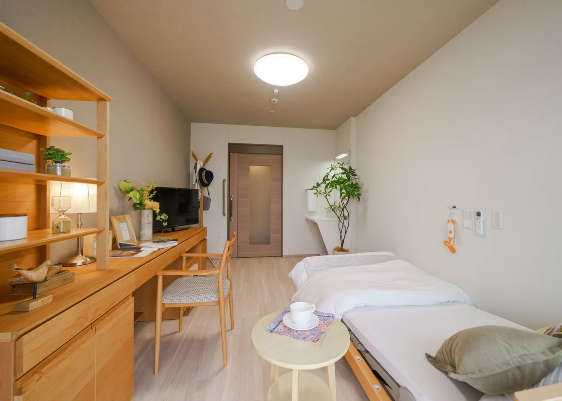 閑静な住宅街の一角に施設はございます。玄関を通ると開放的なエントランスが広がり、インテリアや調度品はこだわりのあるものが配置されています。エントランス近くにはカフェコーナーがあり、お茶を飲みながら談笑を楽しむなど、ゆったりとした時間をお過ごしいただけます。そのほかの共有スペースには、鉄板焼きコーナー、ウッドデッキテラス、浴室、機能訓練室などの充実した設備が完備されています。居室は全37戸あり、1人部屋のほか2人部屋のご用意もございます。お部屋の種類は5タイプより選択が可能で、ライフスタイルに合わせてお選びいただけます。