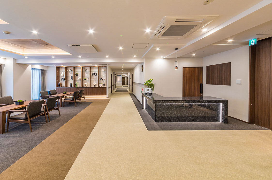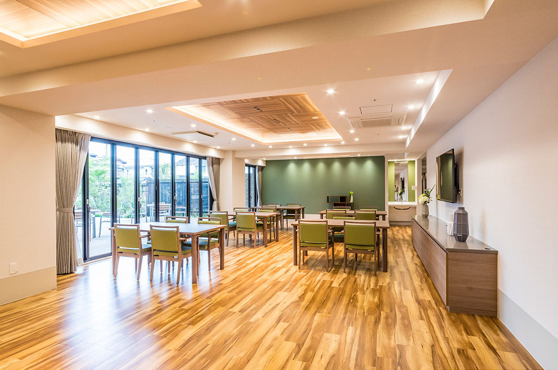 アズハイム三鷹は、落ち着いた色合いで和モダンな外観の4階建て介護付き有料老人ホームです。デッキテラスから続く中庭や屋上庭園、ガーデニングスペースなど、施設に居ながらも外気に触れ、季節の移り変わりを肌で感じられる空間が用意されています。段差のない自動ドアの玄関を入ると、お庭を一望できるエントランスホールが出迎えてくれます。ラウンジスペースのテーブルセットで歓談、ファミリールームで家族水入らずの時間を過ごしたり、お好みの場所でおくつろぎいただけます。共有浴室は、介護仕様の個浴室が4室、ストレッチャー浴槽・リフト浴槽を備えた機械浴室が1室あり、お身体の状態に合ったタイプをご利用いただけます。