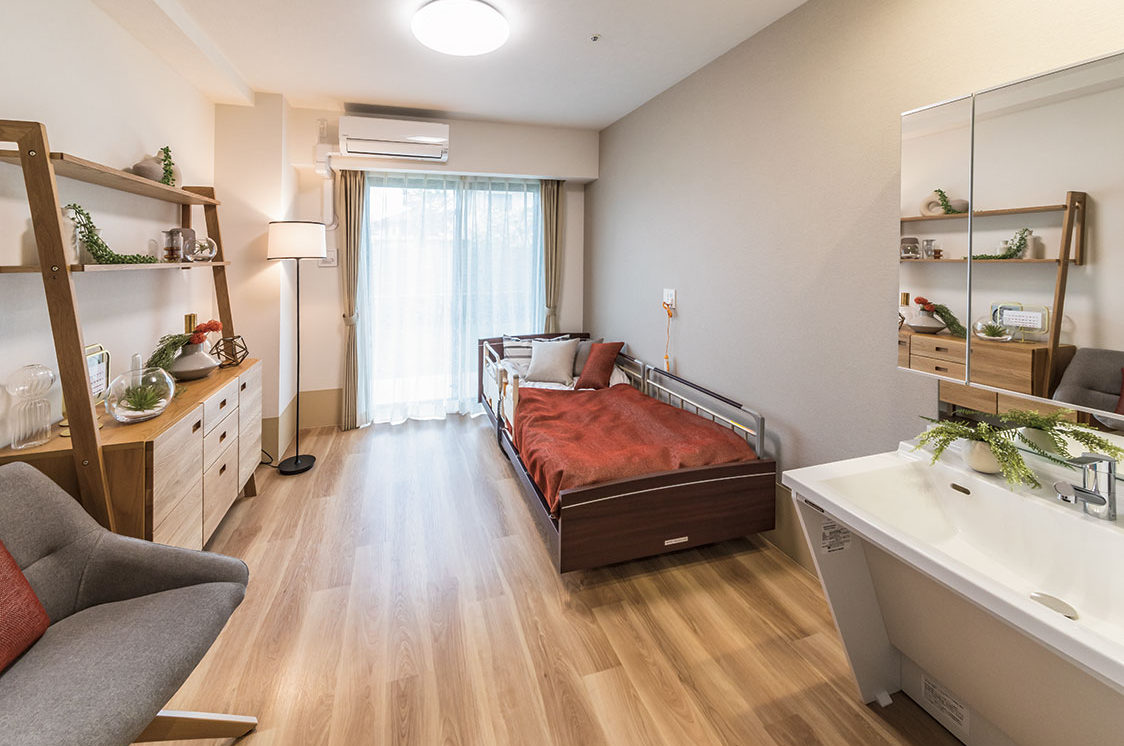 93室ある居室は全てプライバシーが守られる完全個室で、ナースコールが配備された安心して生活できるお部屋です。クローゼットと介護用ベッドが備え付けられており、車椅子対応洗面化粧台・トイレを完備していますので、気兼ねなくお一人の時間を楽しめます。