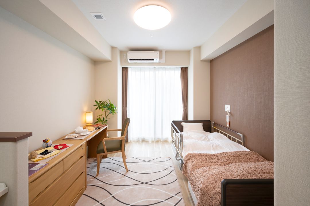 完全個室の各居室は、車いす対応型のトイレと洗面台を完備しています。ベッド脇とトイレ内にナースコールが配備されているうえ、人感センサーや温湿度センサーなどを駆使した見守りシステム「ライフリズムナビ®+Dr.」が導入されていますので、安心してお過ごしいただけます。