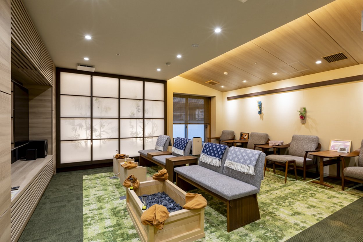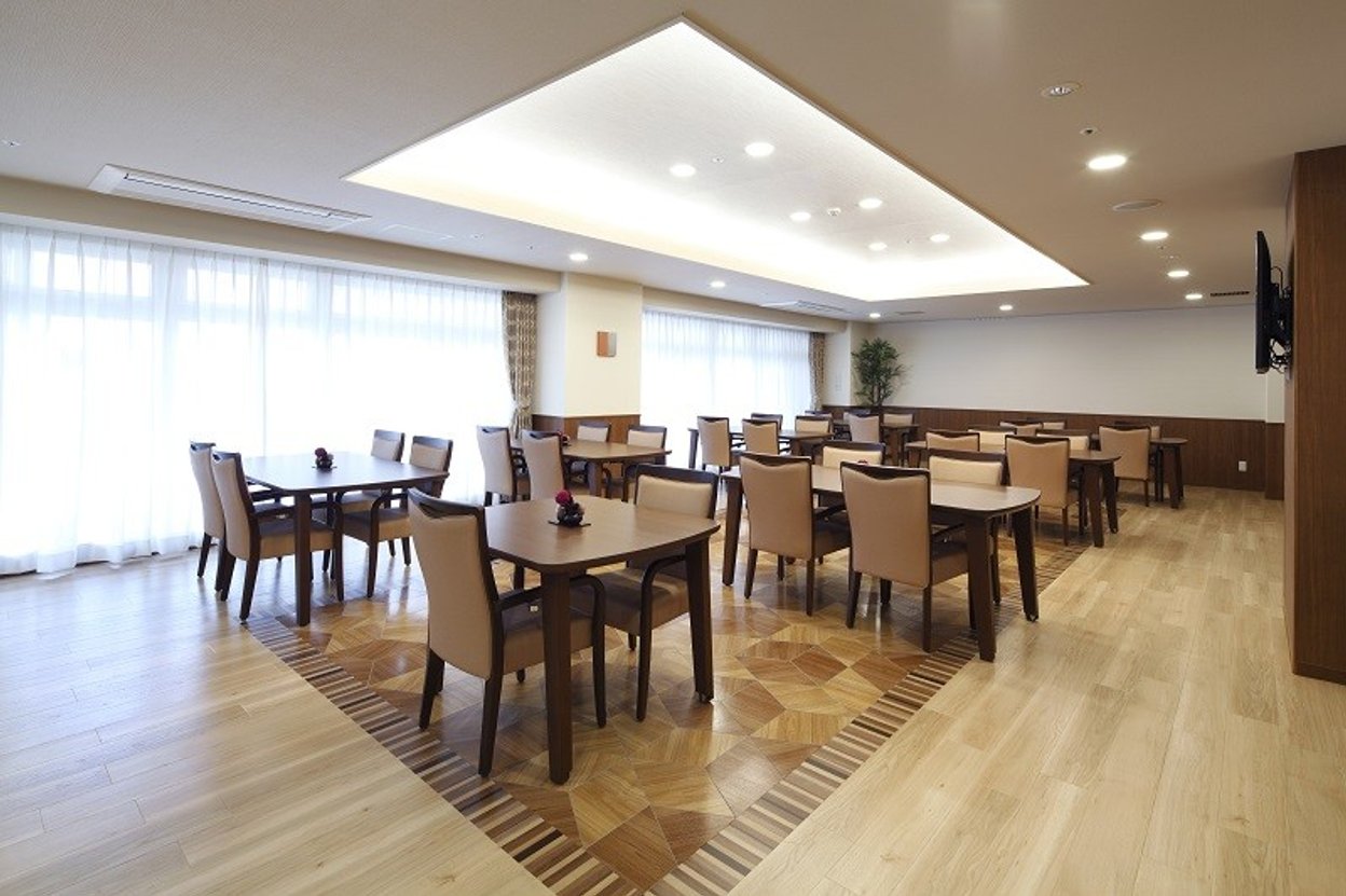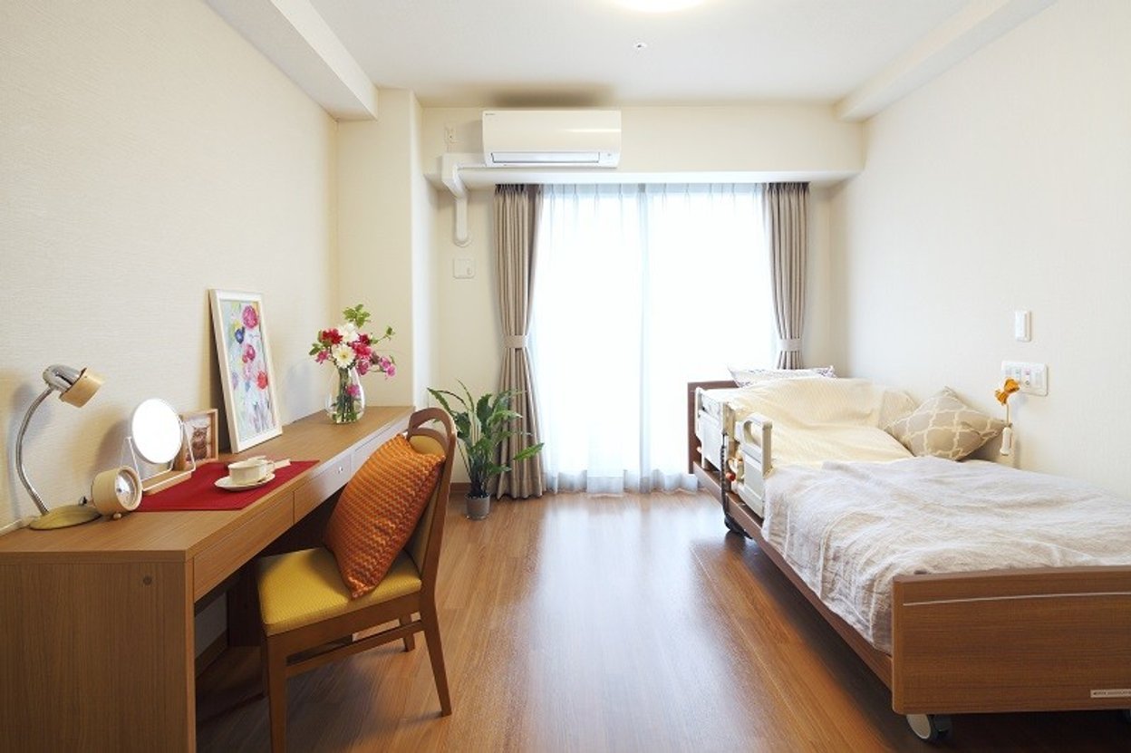 居室は全部で69室あり、そのうち6室はご夫婦お二人での入居が叶う広めのお部屋です。トイレと洗面台を完備した室内には、電動式介護用ベッドや収納家具、デスクセットが備え付けられており、少しのお荷物で新生活をスタートできます。ナースコールでスタッフを呼べる安心感と共に、快適な毎日を過ごせます。