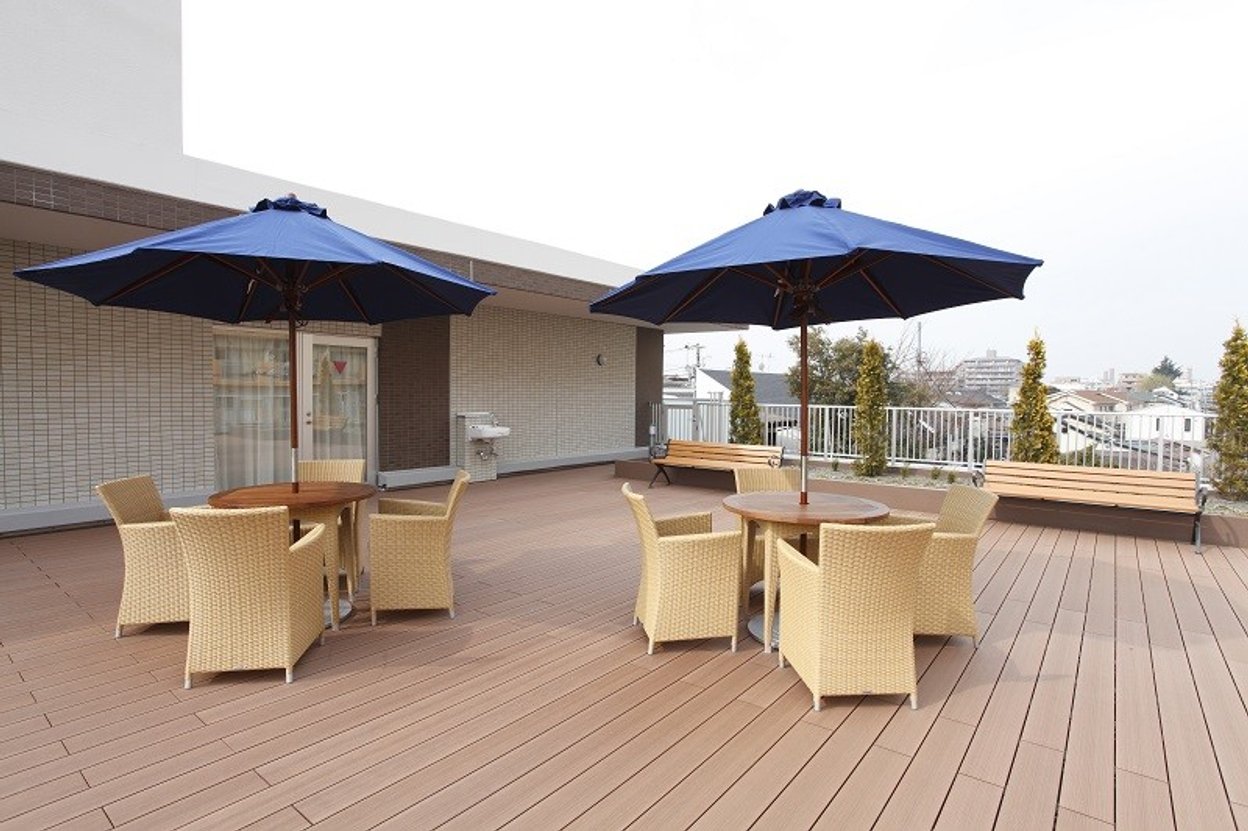 傾斜地に建つ地下1階・地上3階建の建物で、前面道路に接するエントランスは地下1階にあたります。玄関はガラス張りの自動ドアが採用されており、車いすや歩行器をご利用の方も不自由なく出入りできます。エントランスホールや共用廊下は落ち着いた色合いのカーペット敷きで、ソファや椅子に座ってゆっくりとお寛ぎいただけます。リビングダイニングと浴室は各階にございますので、食事やレクリエーション、入浴の度にフロア移動をする必要がありません。訪問理美容サービスを受けられるヘアーサロン、足温浴設備もあるリラクゼーションサロン、リハビリ機器が揃う機能訓練室など、快適な生活を支える共用設備が充実しています。3階のルーフデッキでは気軽に外気浴ができるほか、花壇でのガーデニングをお楽しみいただけます。