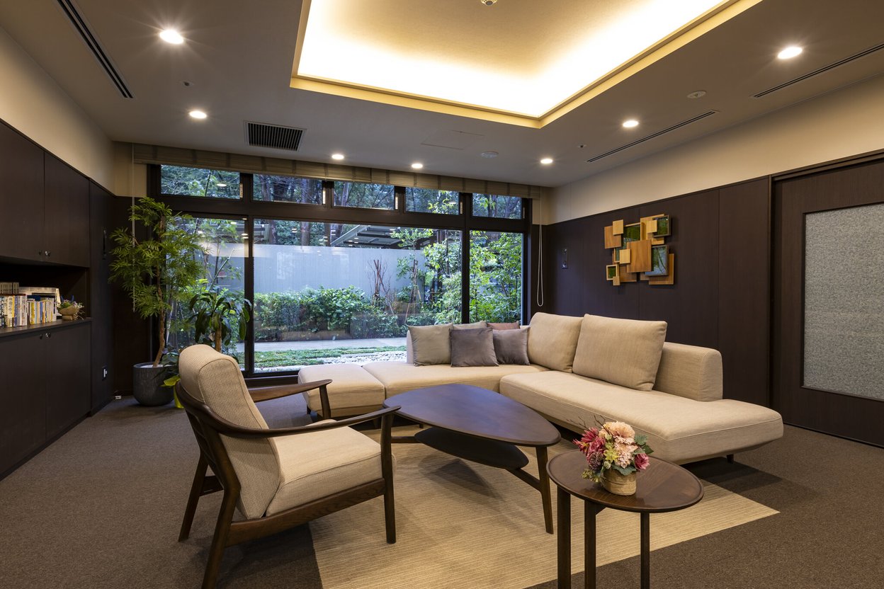 直線的なデザインでモダンな印象の外観を持つ、6階建ての介護付き有料老人ホームです。バリアフリー設計の館内には、読書や歓談を優雅に楽しめるパソコンコーナー併設のラウンジ、ご家族ご友人と水入らずで過ごせるファミリールーム、本格的なシャンプー台を完備した理美容室など、上質な毎日を叶えてくれる共有設備が整っています。各居室フロアにあるリビングダイニングは、隣接する公園に面していますので、豊かな緑に囲まれてお食事をお召し上がりいただけます。屋上にあたる6階にはデッキテラスがあり、スカイツリーや東京タワーを眺めながら外気浴を楽しめます。共用浴室は個浴室が各居室フロアにあるほか、介助が必要な方向けのリフト付き浴室と、介護度の高い方向けの特別浴室が1階にございます。