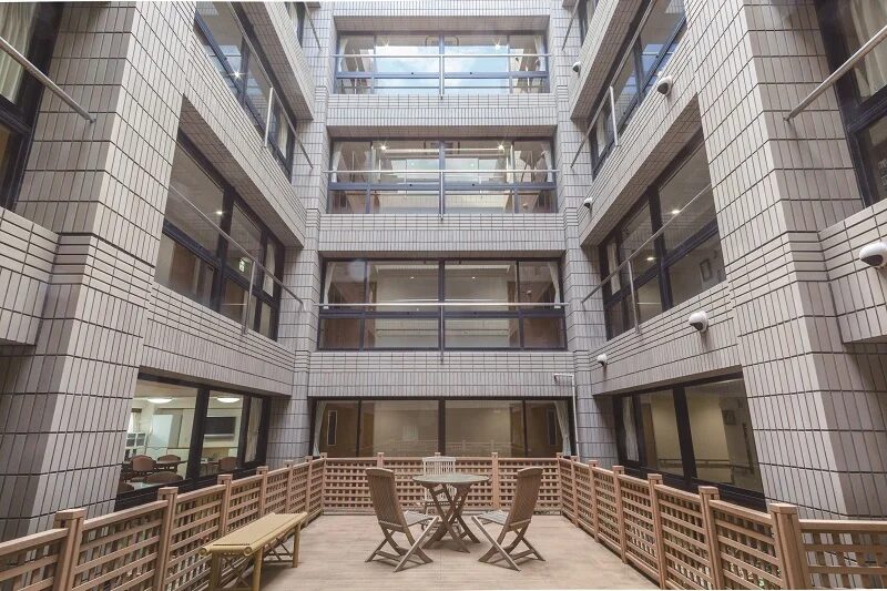 地下1階・地上5階建て、タイル張りの重厚な外観の介護付き有料老人ホームです。建物の中心部3か所に上部吹き抜けのライトコートがあるため、館内は明るい自然光に恵まれています。多くの時間を過ごすリビングダイニング、リハビリ機器を完備した機能訓練室、シャンプー台を備えた理美容室など、ホームでの快適な毎日を支える共有設備が揃っています。浴室は、個浴室、リフト付き一般浴室、特別浴室の3室がございますので、お身体の状態に合った入浴方法をお選びいただけます。