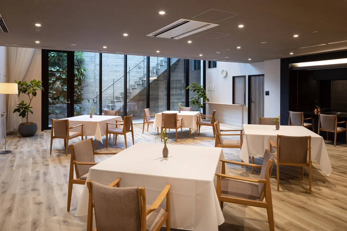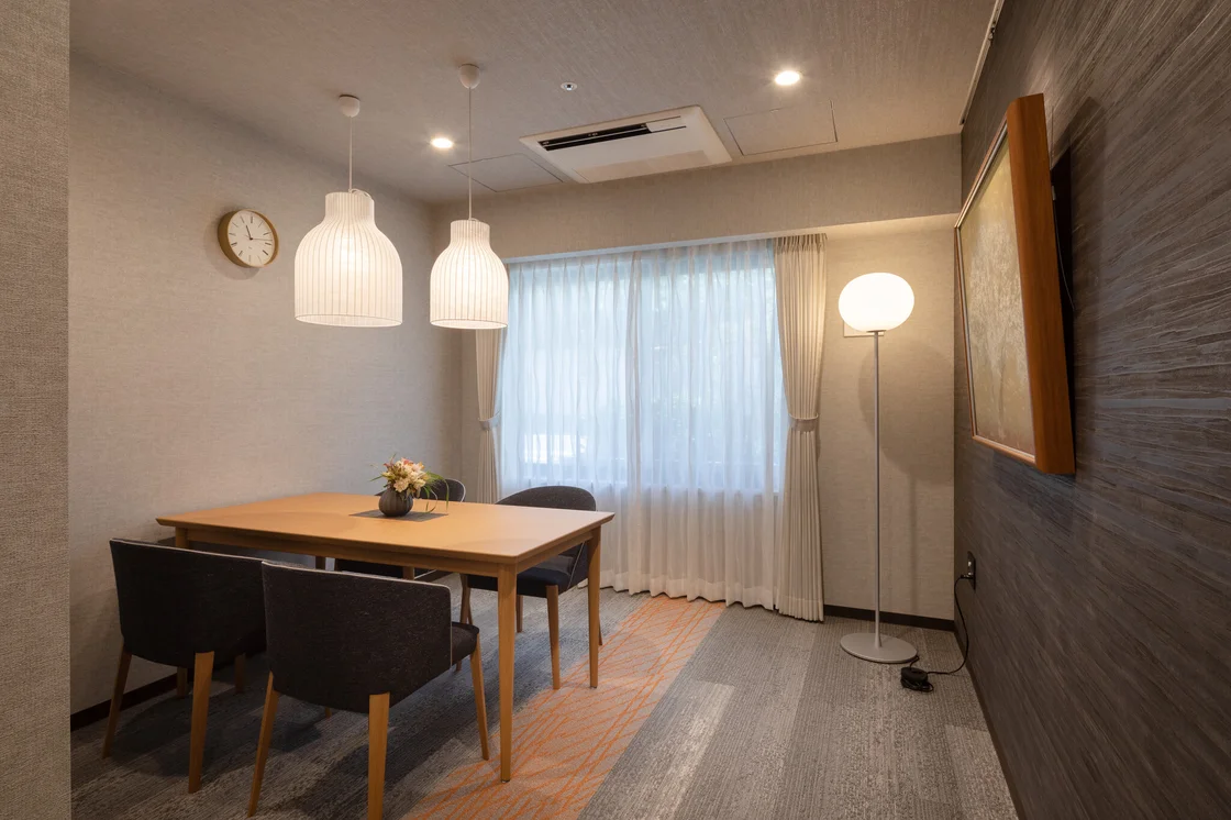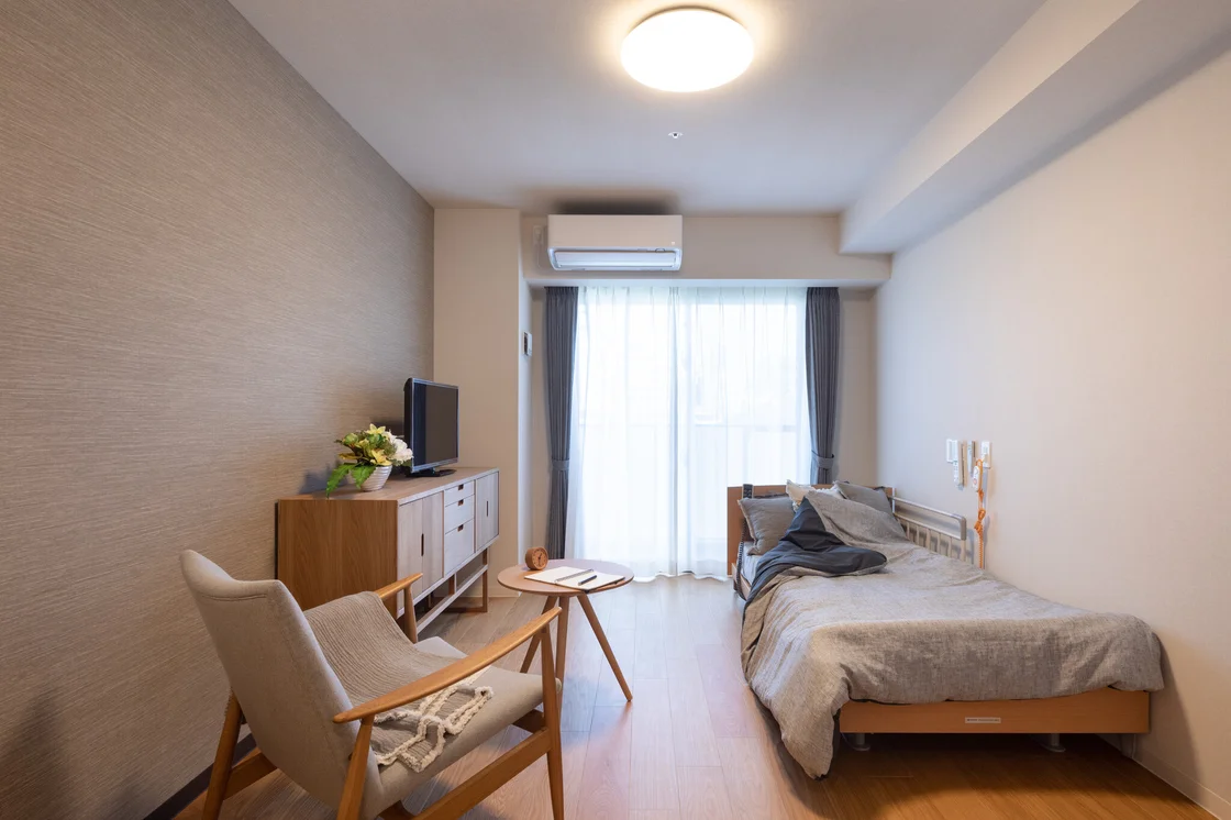 玄関を通ると館内はシックな雰囲気で、アート作品が随所に飾られ心穏やかにお過ごしいただける空間づくりがされています。カフェコーナーは各階に配置されていますので、思い思いにゆっくりとお過ごしいただけます。その他の共有スペースとして、応接室、機能訓練室、ダイニング、鉄板焼きコーナー、浴室などが完備されています。居室数は全30戸、1人部屋のほか2人部屋のご用意もございますので、ライススタイルに合わせてお部屋をお選びいただけます。居室内にはナースコールはもちろんのこと、洗面台、トイレ、収納なども設備が完備されています。また、2人部屋にはミニキッチン・浴室が完備されています。