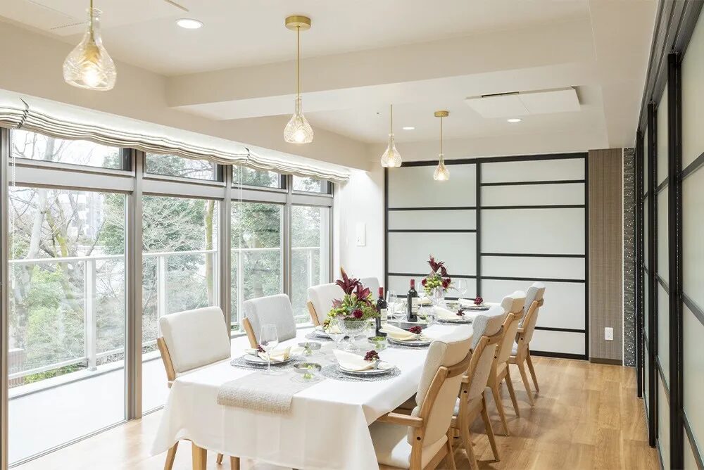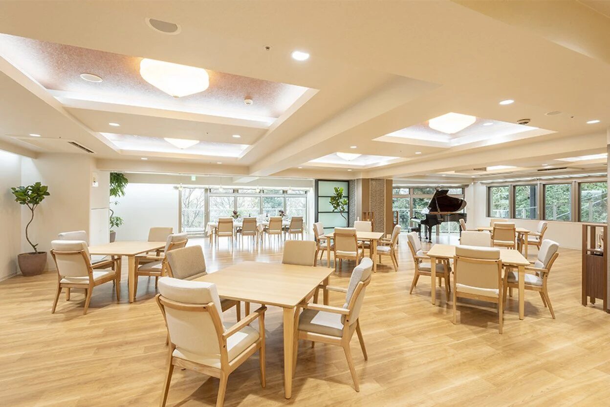 閑静な高級住宅街の路地を突き当たったところに建つ、地下1階・地上3階建の介護付き有料老人ホームです。高台に位置しているため開放感があり、最上階のガーデンテラスでは外気浴をしながら周辺の眺望をお楽しみいただけます。各フロアにダイニングやラウンジが配されていますので、お部屋に閉じこもることなく、ほかのご入居者様との歓談や息抜きにご利用ください。プロの理美容師の施術が受けられる本格的なビューティーサロン、常駐の作業療法士によるリハビリ指導を受けられる機能訓練室、畳敷きの共有スペースなど、上質な生活を支えてくれる共有設備が充実しています。共用の個浴室は各フロアにございます。機械浴を備えた大浴場では、大画面モニターに映し出される風景を眺めながらお湯に浸かることができます。