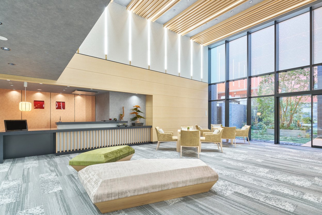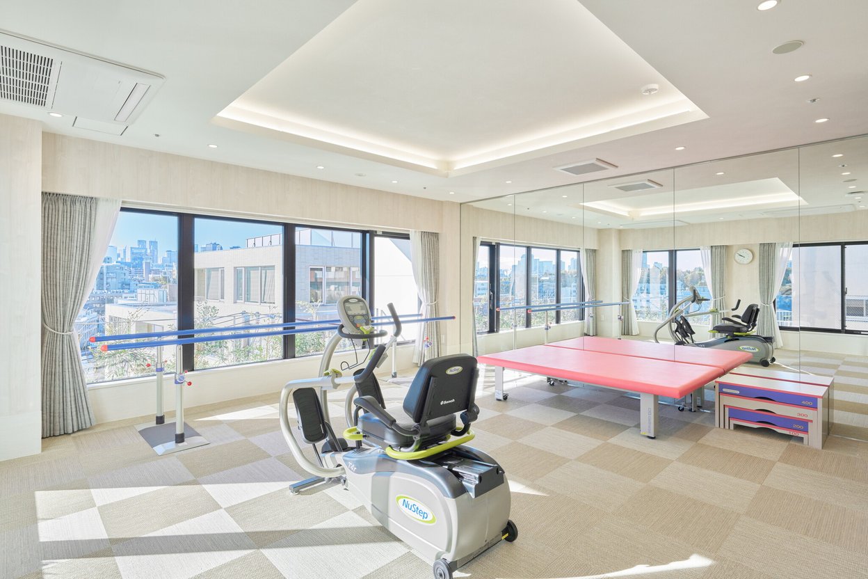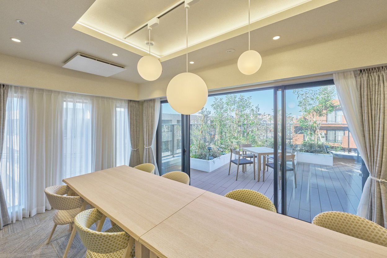 閑静な住宅街にある、5階建ての介護付き有料老人ホームです。館内は明るい色調の内装で、吹き抜けの開放感あるエントランスロビーが訪れる人々を迎えてくれます。階によってデザインやコンセプトが違う居室フロアのダイニングは、ご入居者様同士の交流の場として賑わっています。最上階には、周囲の街並みを眺めながら運動できる機能訓練スペース、広い屋上テラスに面している完全個室のファミリールーム、奇麗に手入れされた植栽の中で歩行訓練ができる屋上庭園、安全に入浴できる共用浴室など、充実の共有設備が揃っています。