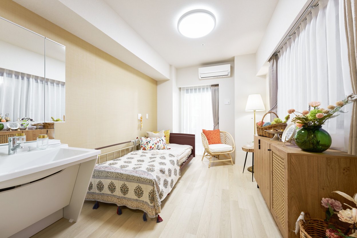 全72室の居室は、トイレ・洗面台完備の完全個室です。介護用ベッドは備え付けられていますので、家具家電など必要なものを持ち込んで、自分好みにお部屋を作りあげられます。