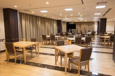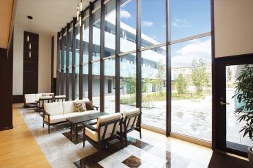 中庭を囲むように建つコの字型の建物内に、97室の居室を備えた介護付き有料老人ホームです。ガーデニングを楽しめる中庭と、気軽に外気浴が出来る屋上庭園では、施設に居ながら季節の変化を感じることができます。お好きな映画を大画面で鑑賞できるシアタールーム、身だしなみを整えられる理美容室、健康器具を完備したフィットネスルームなど、充実の共有設備が快適な毎日を叶えてくれます。共用浴室はスロープ付きの一般浴槽、2種類の特殊浴槽、個浴槽がございますので、お身体の状態やご希望に合わせてご利用いただけます。エントランスホールやレストラン、カフェスペースも自由にご利用いただけますので、お好きな場所で歓談やテレビ観賞などをお楽しみください。