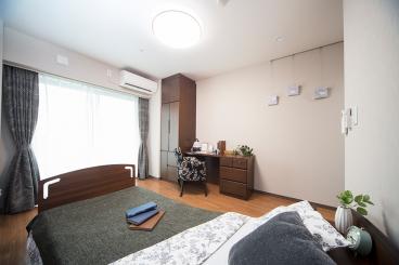 完全個室の各居室は、電動リクライニング式ベッド、木製キャビネット、収納家具などを完備していますので、すぐに生活をスタートできます。約23帖の二人部屋もございますので、ご家族・ご親族と一緒の入居も可能です。
