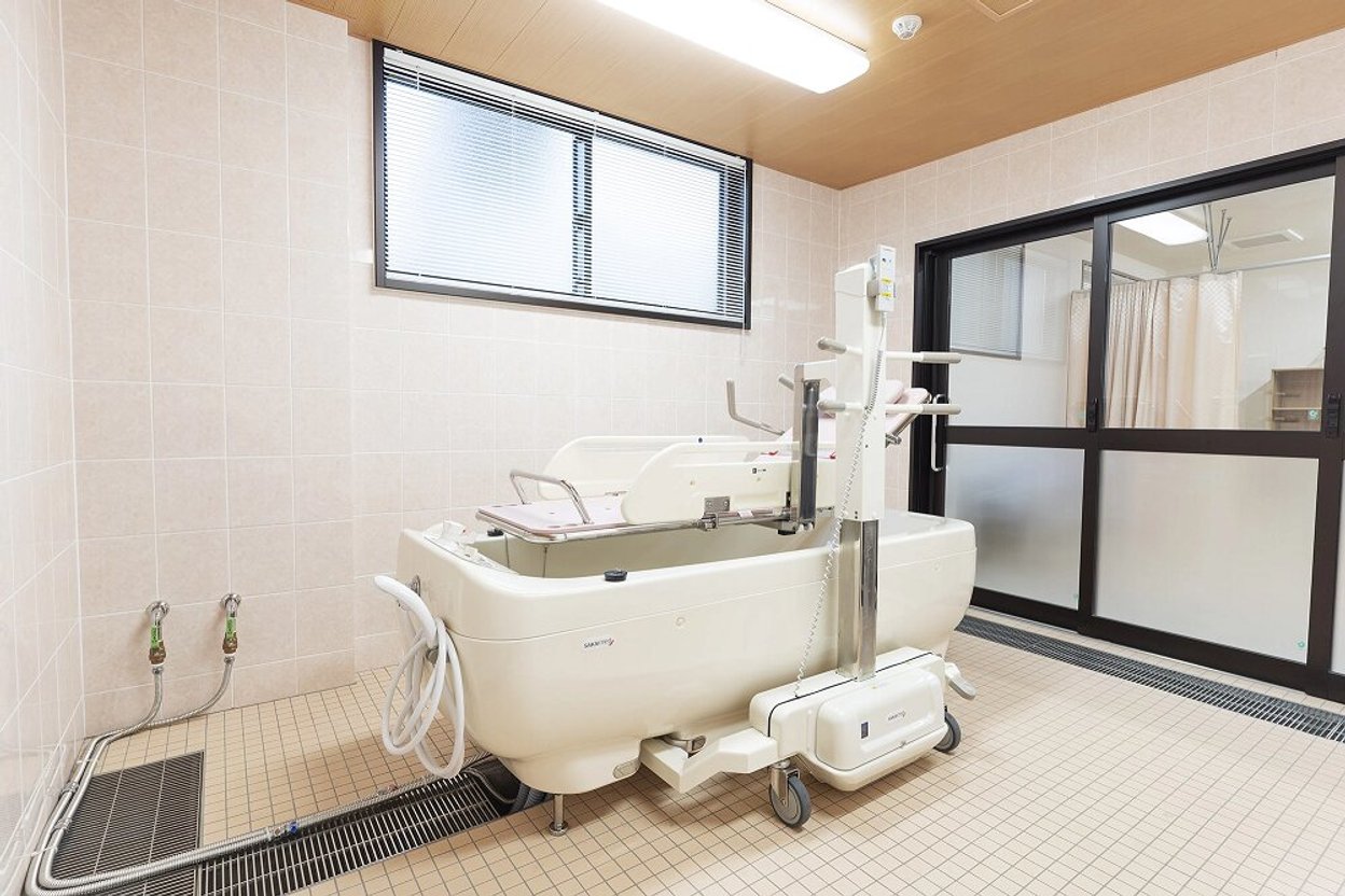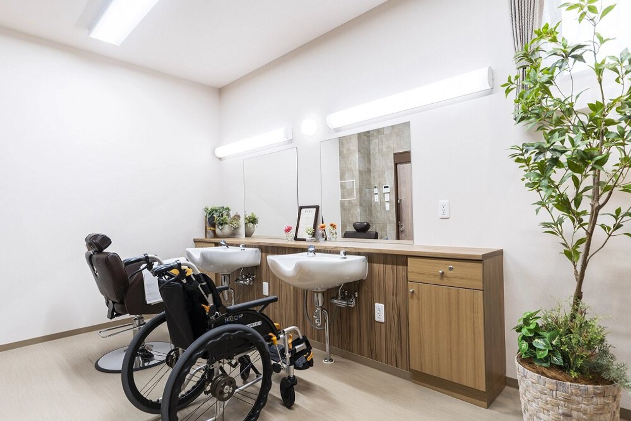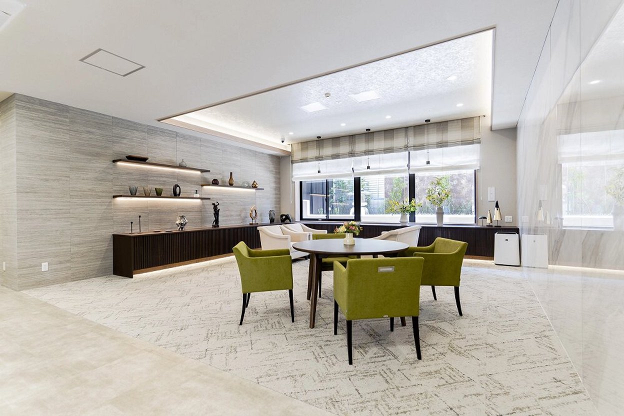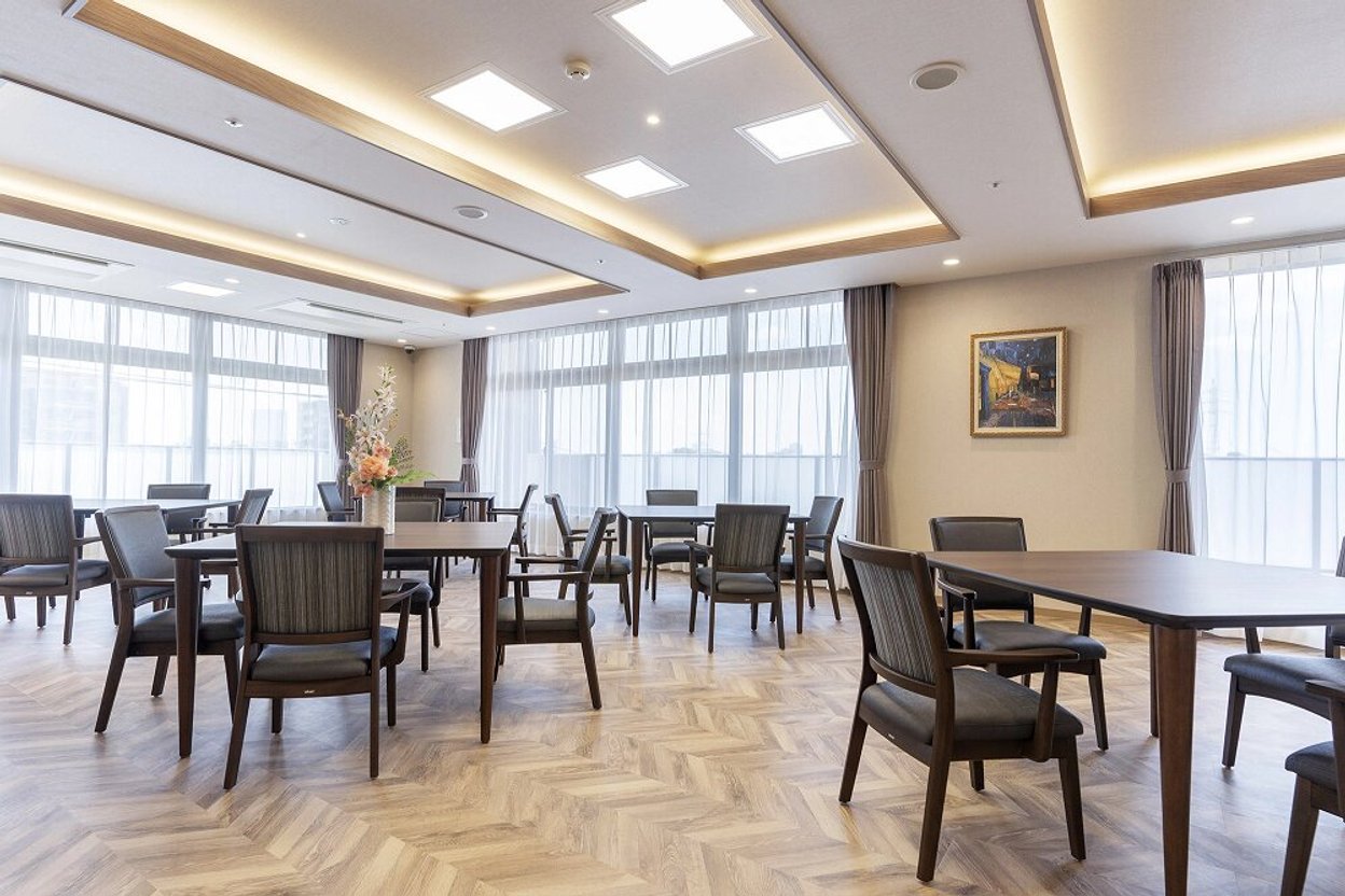 2024年10月にオープンした、サービス付き高齢者向け住宅/介護付有料老人ホ-ム(一般型特定施設入居者生活介護)です。駐車場を有する広い敷地にゆとりをもって建てられた3階建ての建物で、最大70名が生活しています。前面道路から玄関までは緩やかな坂になっていますが、手すり付きの歩行者用スロープがありますので、歩行に不安がある方や車いすをご利用の方も安全にお出かけいただけます。館内は白い大理石調のタイルや深い色合いのフローリングが使用された、落ち着きのあるインテリアで纏められています。エントランスラウンジや各フロアの食堂兼機能訓練室、2・3階のテラス庭園など、居心地の良い共有設備が整っています。共用浴室は個浴室4室と中浴室1室、機械浴室1室があります。介護度が高い方も介助を受けながら安全に入浴をお楽しみいただけます。