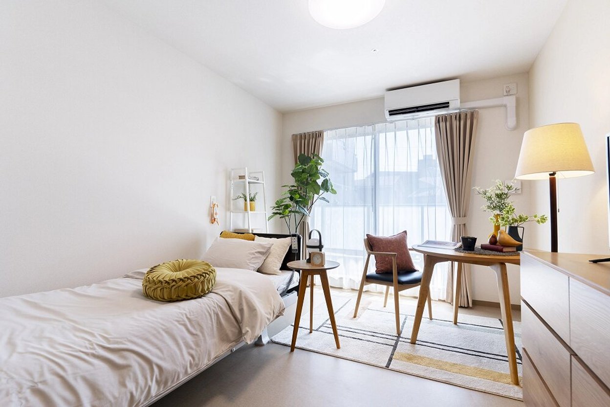 居室はプライバシーが守られる完全個室です。エアコン、介護用ベッド、洗面台、温水洗浄機能付きトイレなどを完備したお部屋には、使い慣れた家具を持ち込めます。