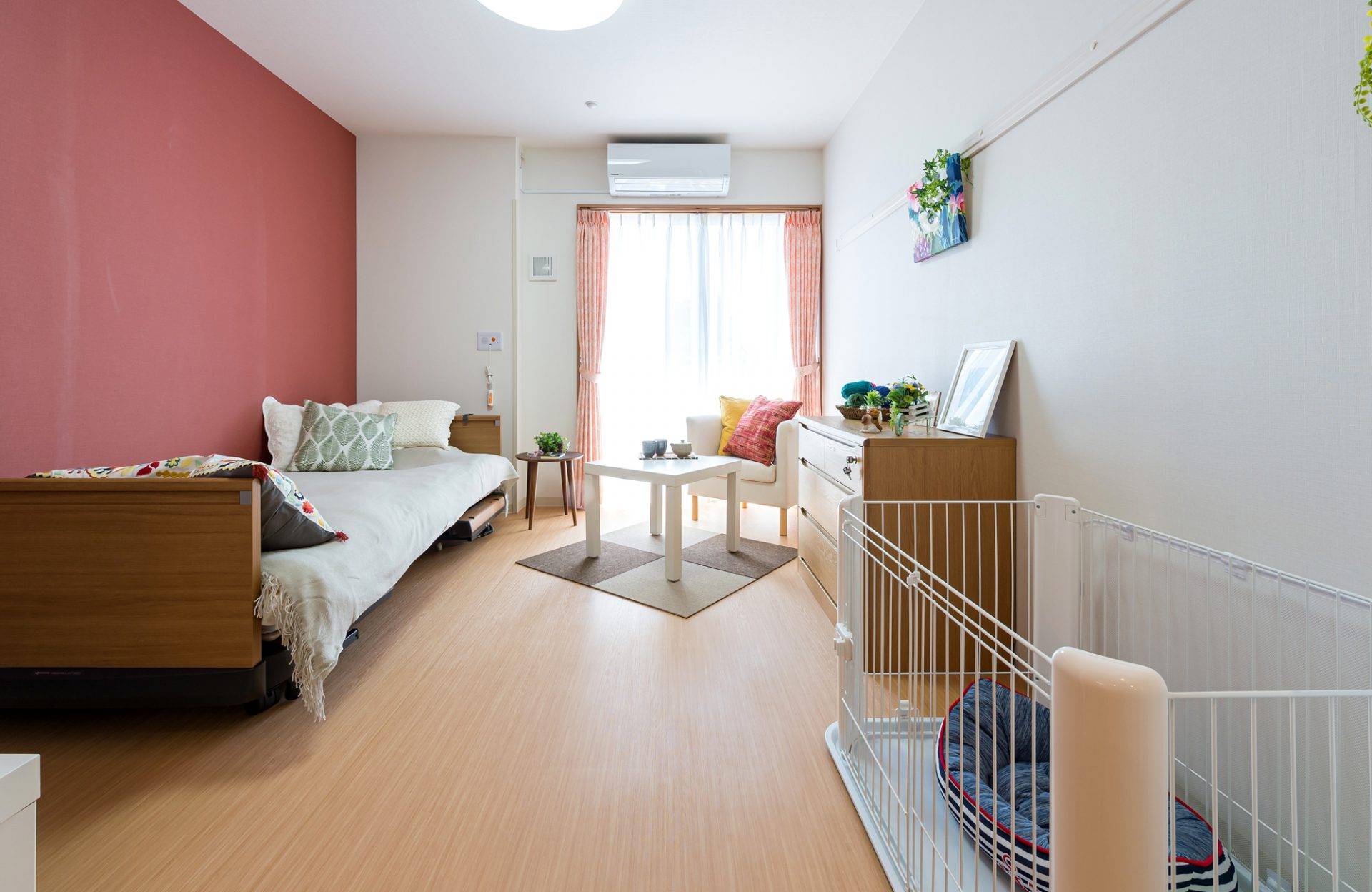 21室ある居室は、温水洗浄暖房便座付トイレと洗面台、浴室、ミニキッチンを備えたワンルームタイプのお部屋です。室内にはペット用ゲージもございますので、愛犬もお部屋で一緒に生活できます。ベッド脇とトイレ内に緊急通報装置が配備されていますので、安心して一人の時間をお楽しみいただけます。