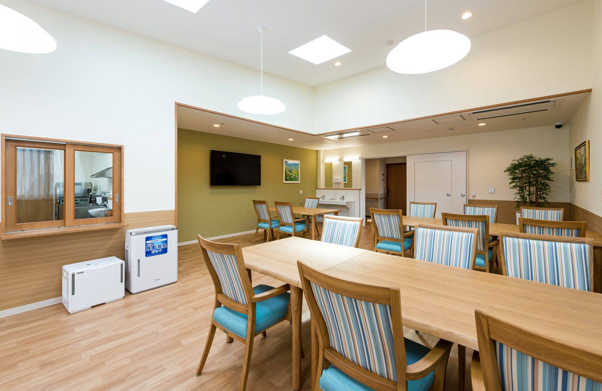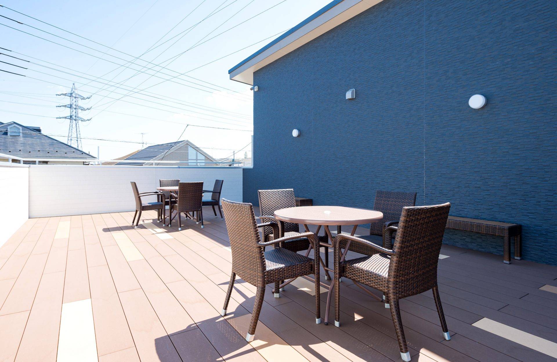 木造2階建てで温かみのある、アットホームな雰囲気のサービス付き高齢者向け住宅です。敷地内駐車場と玄関は、手すり付きのスロープと階段で繋がっています。明るい色調で統一された館内は、車いすや歩行器をご利用の方の通行に支障がないよう、廊下の幅が広く取られているほか、段差を極力なくしたバリアフリー設計です。明るい日差しが差し込む食堂や開放感あふれるルーフバルコニーでは、のんびり寛ぎタイムをお過ごしいただけます。